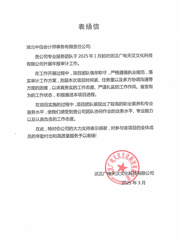 武漢廣電天漢文化科技有限公司表揚信
