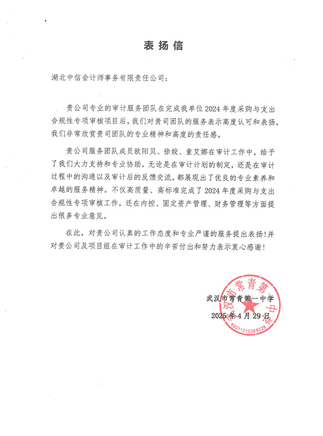 武漢市常青第一中學表揚信