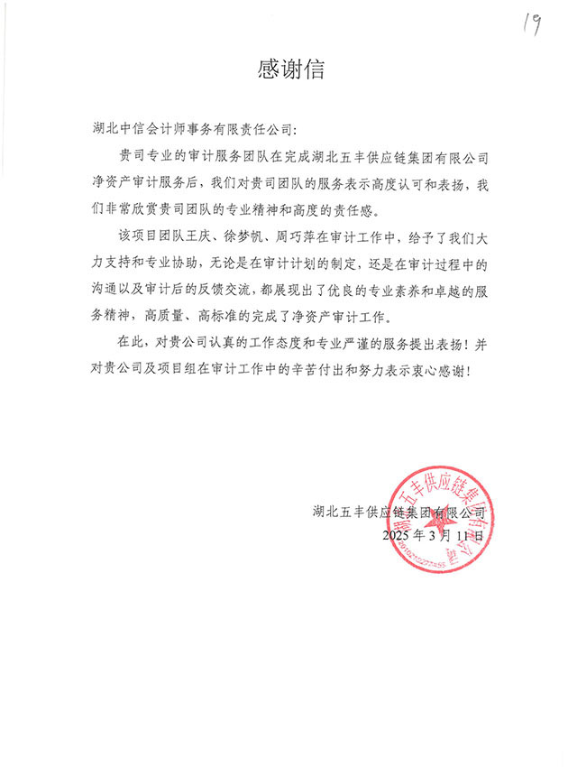 湖北五豐供應鏈集團有限公司感謝信