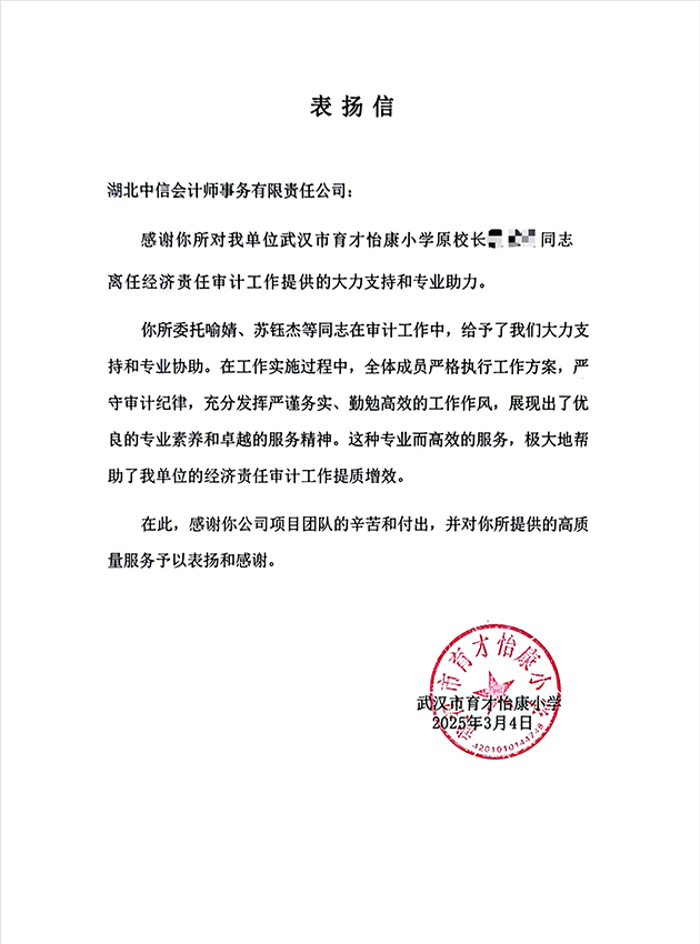 武漢市育才怡康小學表揚信