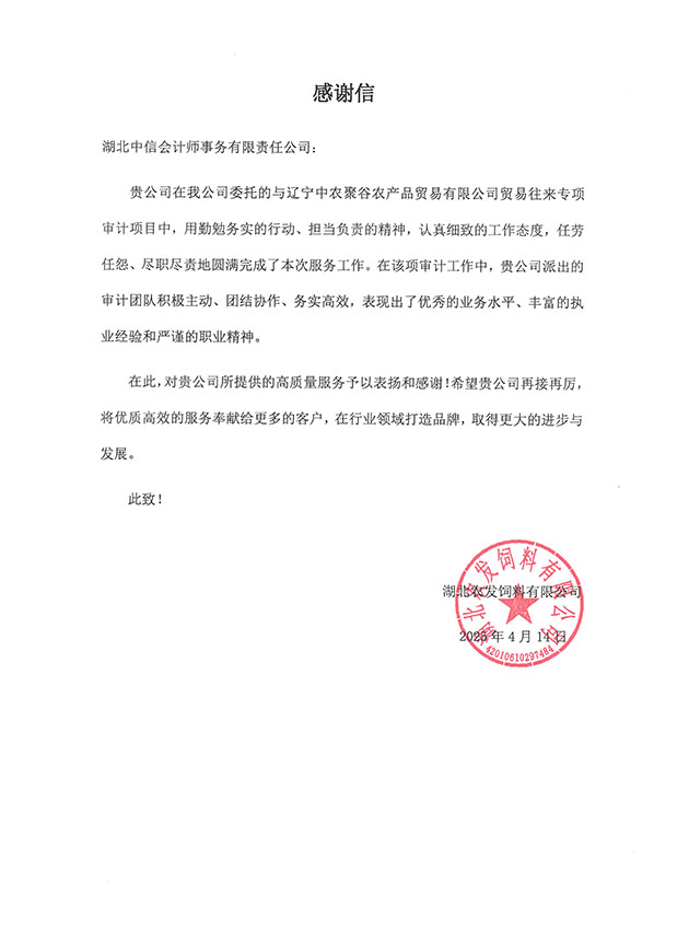 湖北農(nóng)發(fā)飼料有限公司感謝信