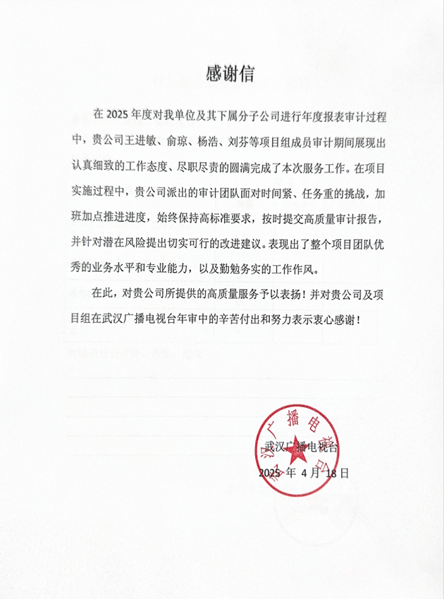 武漢廣播電視臺感謝信