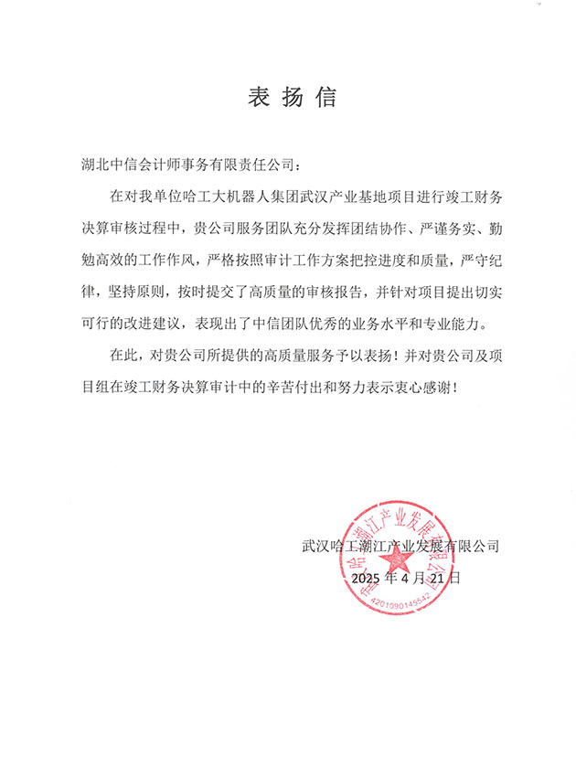 武漢哈工潮江產(chǎn)業(yè)發(fā)展有限公司表揚信