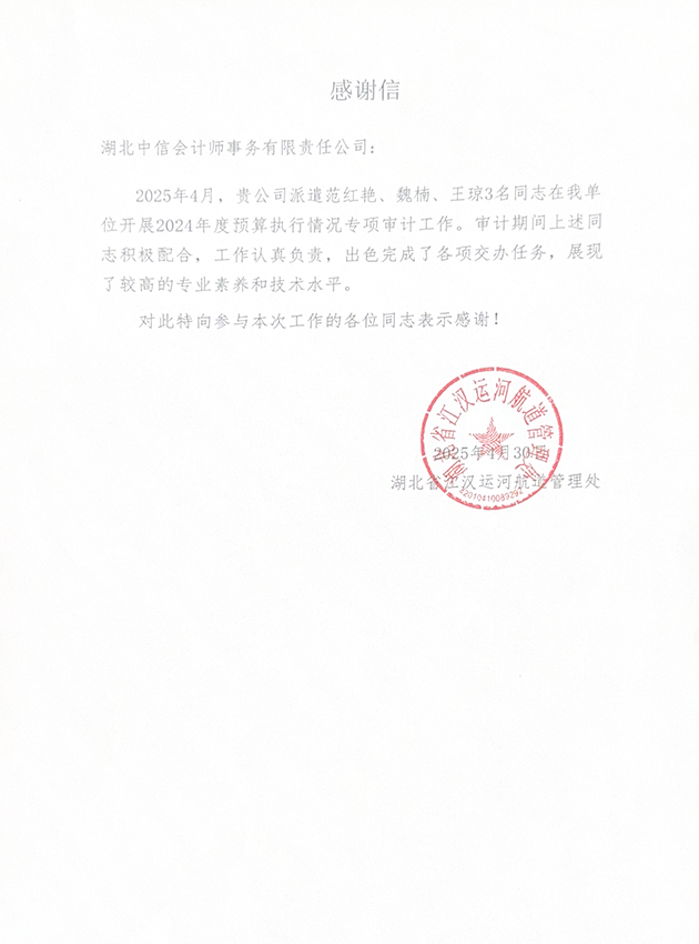 湖北省江漢運河航道管理處感謝信