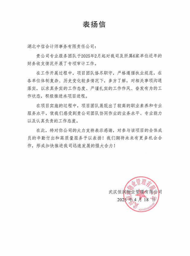 武漢恒潤物業(yè)管理有限公司表揚(yáng)信