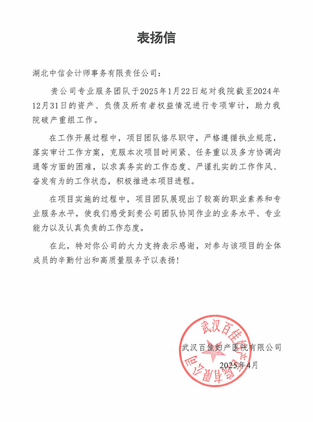 武漢百佳婦產(chǎn)醫(yī)院有限公司表揚(yáng)信
