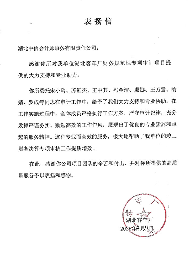 湖北客車廠表揚(yáng)信