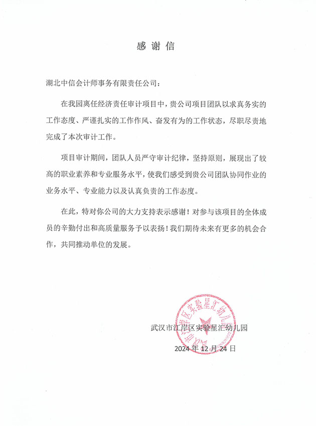 武漢市江岸區(qū)實(shí)驗(yàn)星匯幼兒園感謝信