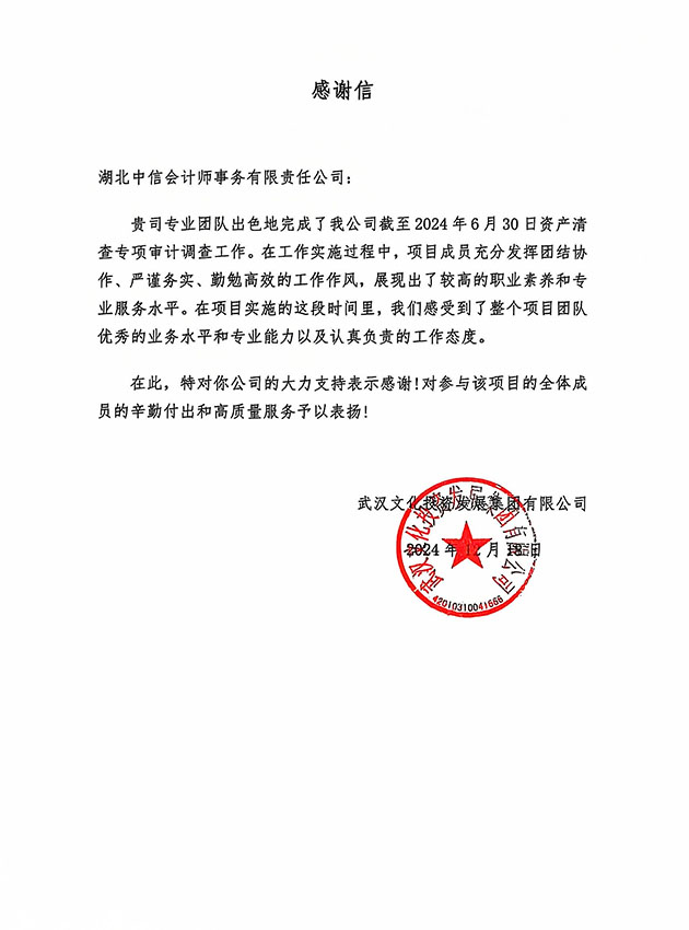 武漢文化投資發(fā)展集團(tuán)有限公司感謝信
