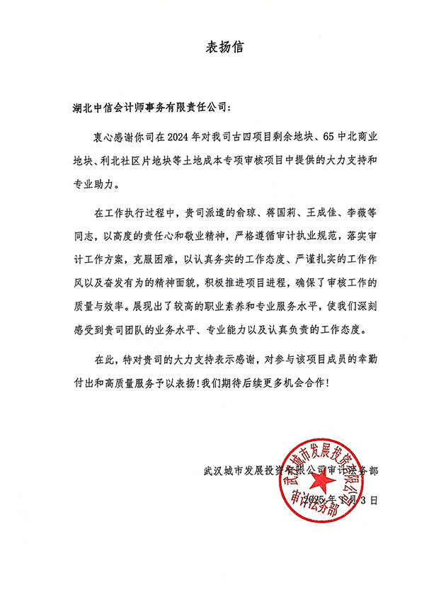 武漢城市發(fā)展投資有限公司審計(jì)法務(wù)部表?yè)P(yáng)信