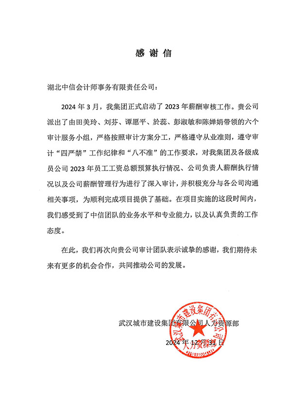 武漢城市建設(shè)集團(tuán)有限公司人力資源部感謝信