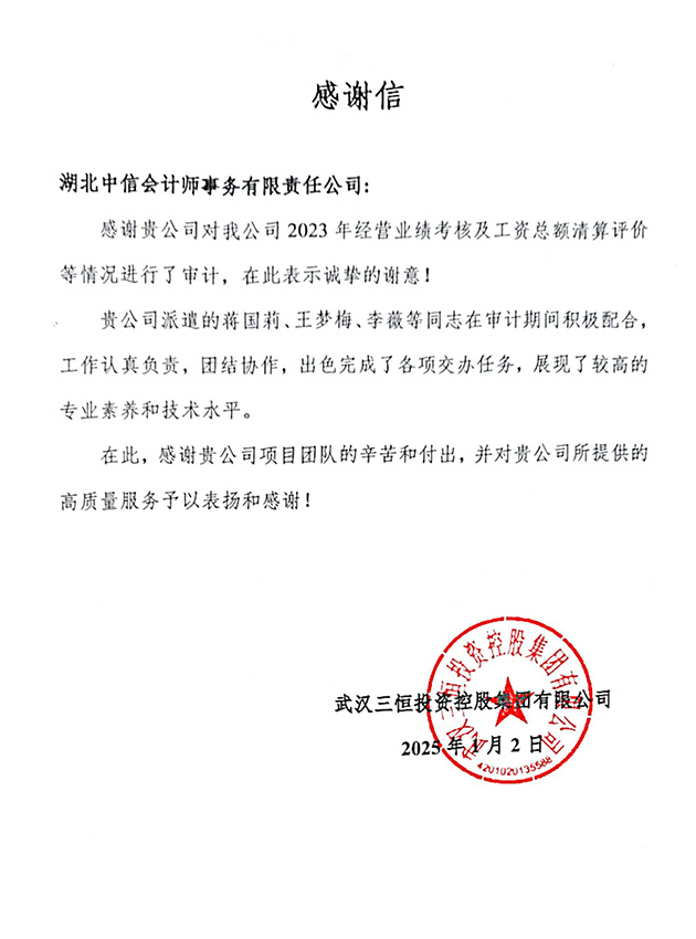 武漢三恒投資控股集團(tuán)有限公司感謝信