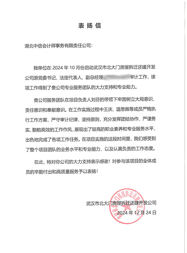 武漢市北大門房屋拆遷還建開發(fā)公司表?yè)P(yáng)信