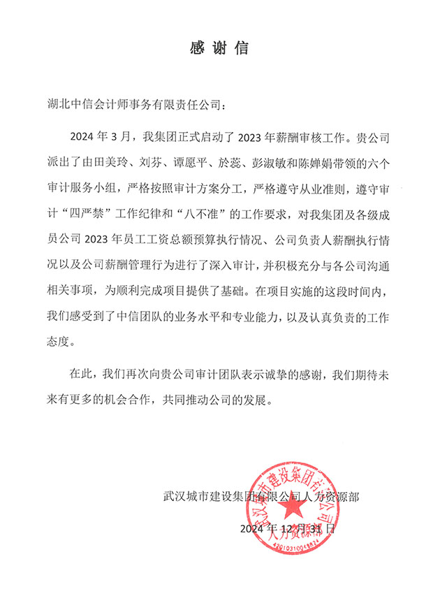 武漢城市建設(shè)集團(tuán)有限公司感謝信