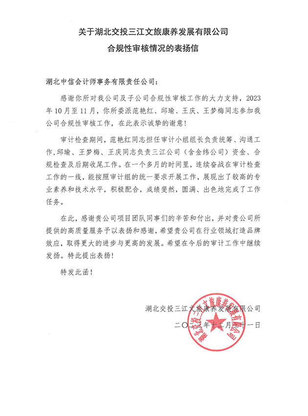 湖北三江文旅康養(yǎng)發(fā)展有限公司合規(guī)性審核項目表揚信