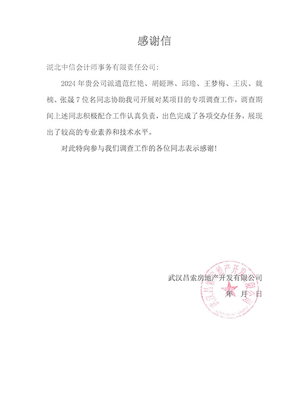 武漢昌索房地產開發(fā)有限公司專項調查項目感謝信