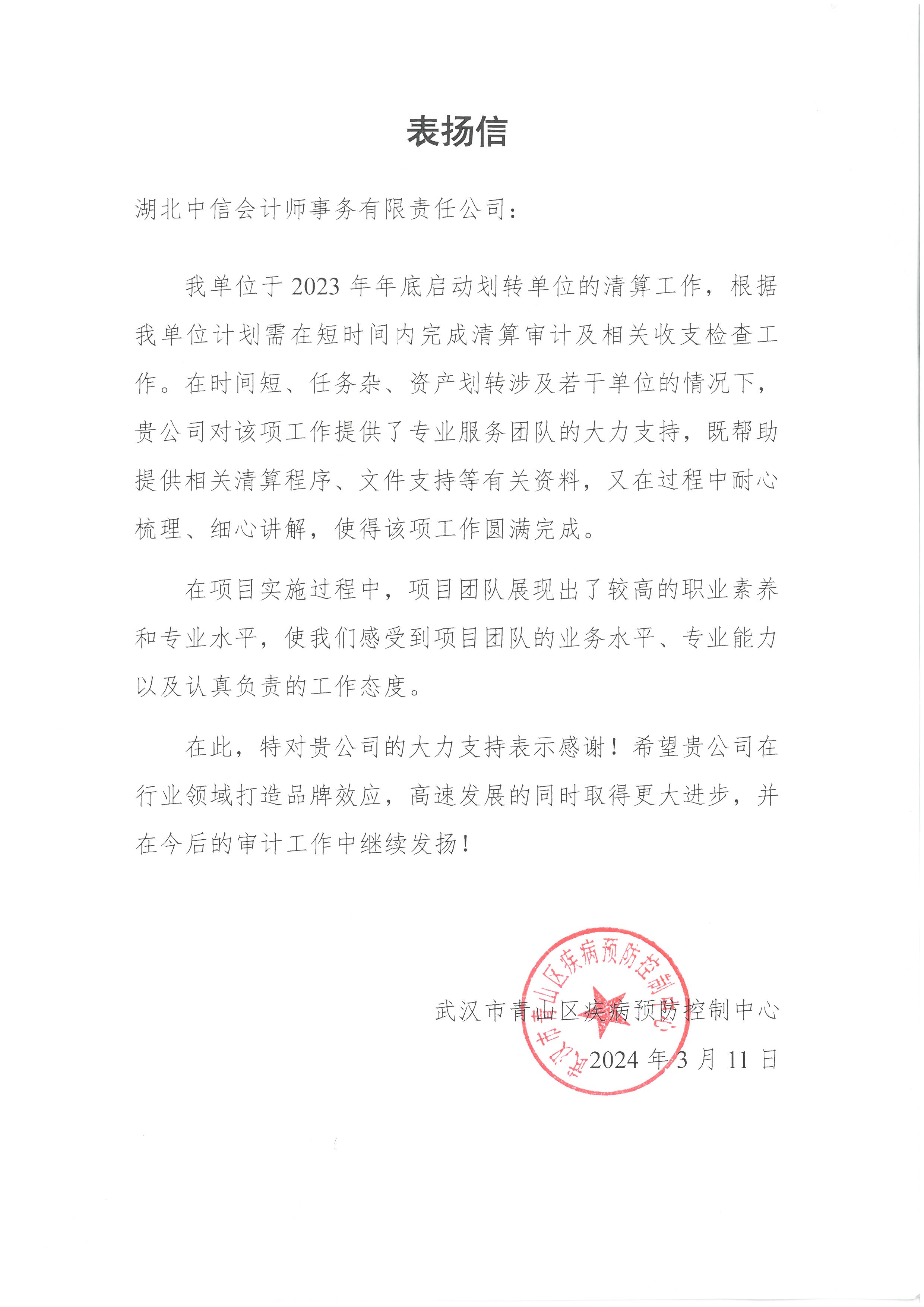 青山區(qū)疫病預防控制中心清算審計及收支檢查項目表揚信