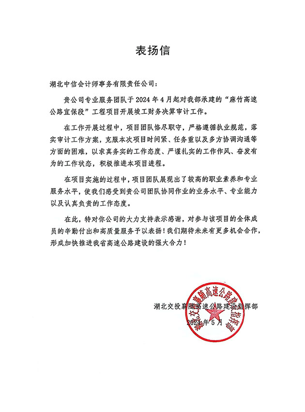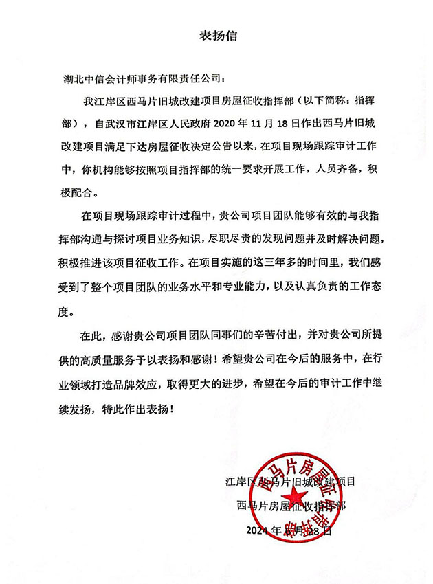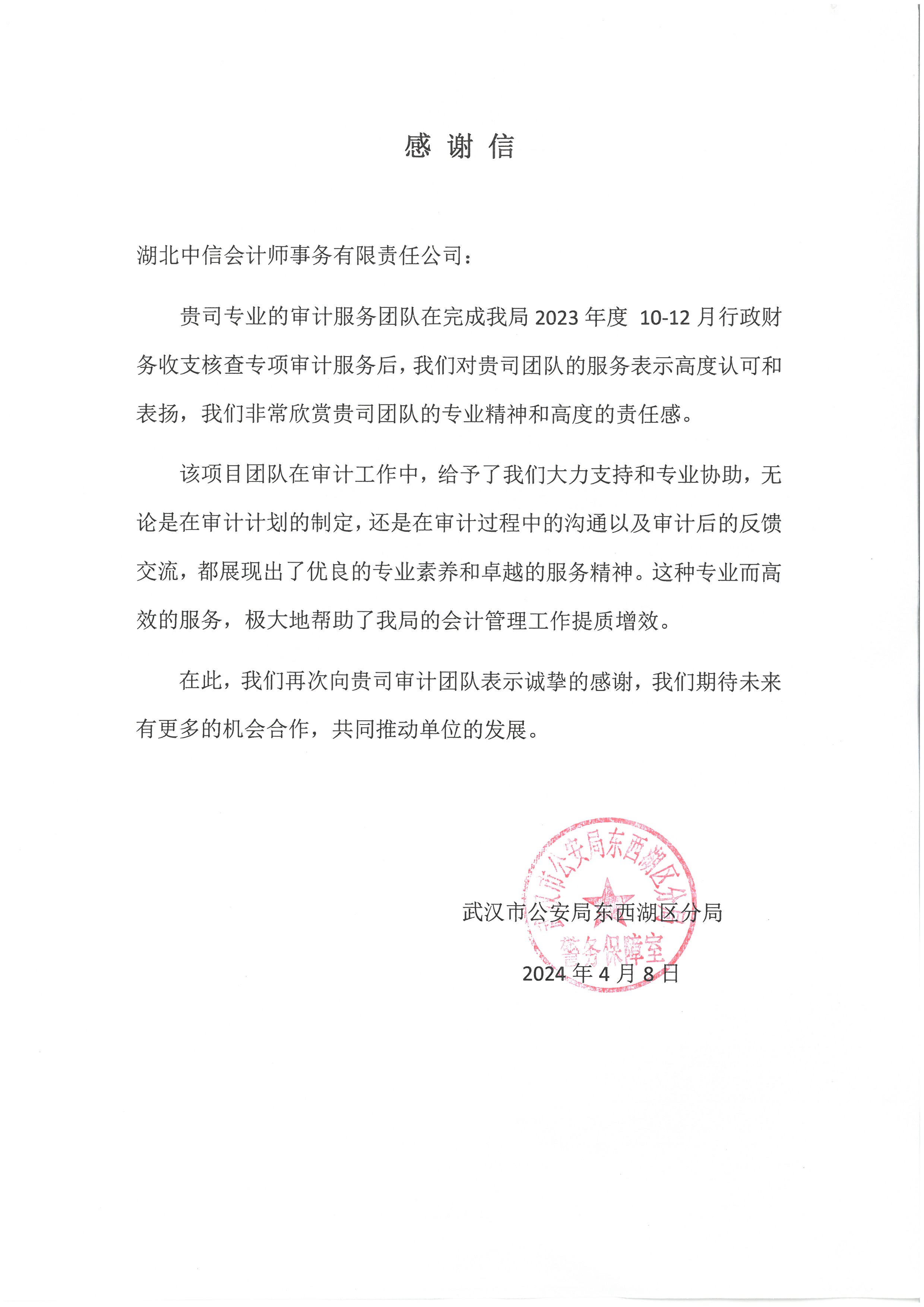 武漢市公安局東西湖區(qū)分局財務收支核查專項審計感謝信
