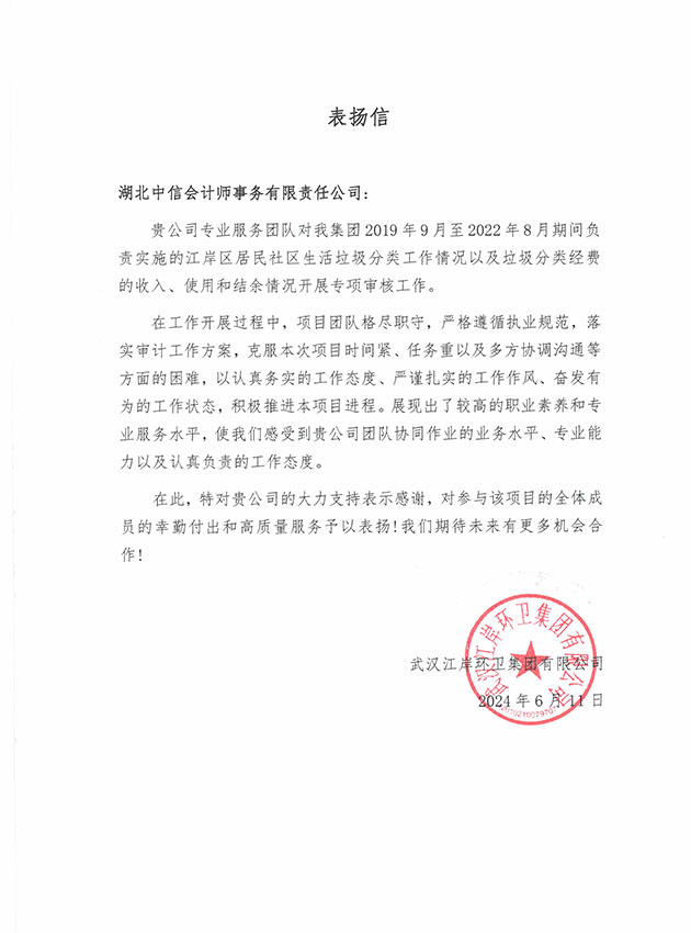 武漢江岸環(huán)衛(wèi)集團有限公司表揚信