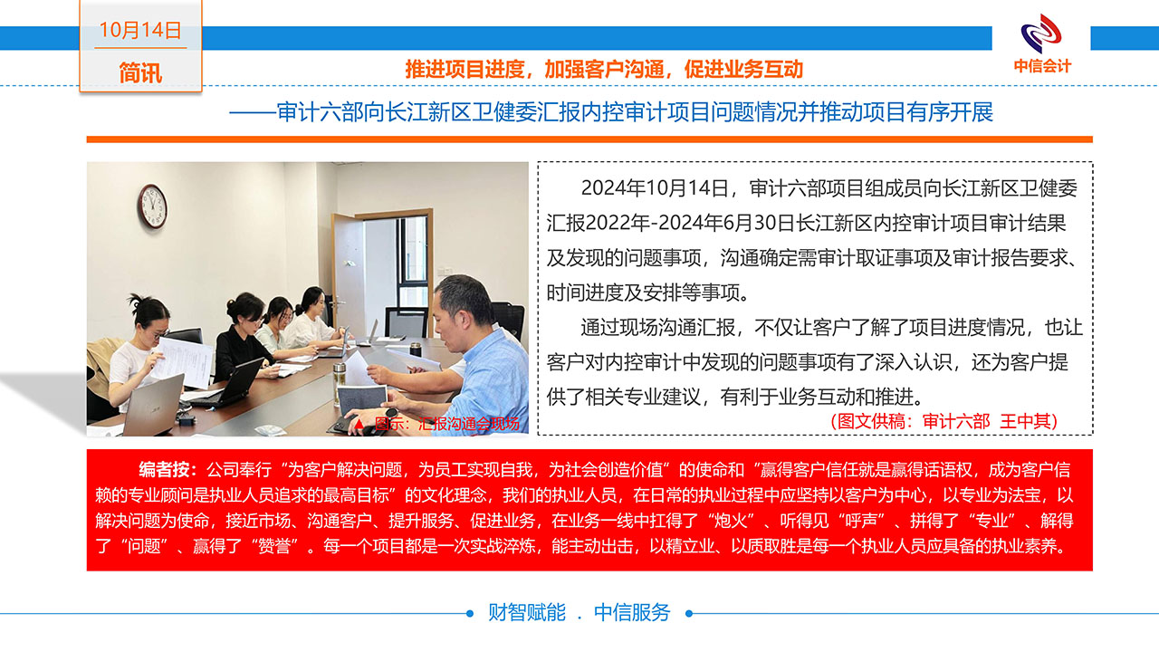 ——審計六部向長江新區(qū)衛(wèi)健委匯報內(nèi)控審計項目問題情況并推動項目有序開展 -