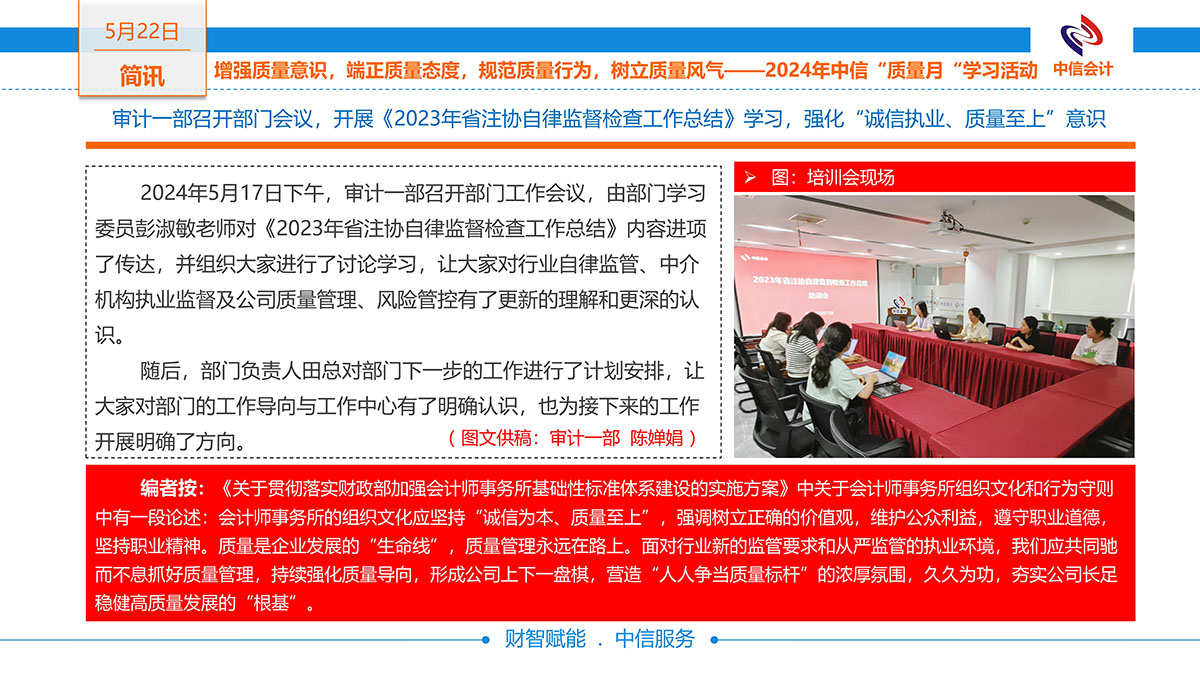 ——2024年中信“質(zhì)量月“學習活動系列:審計一部召開部門會議,開展《2023年省注協(xié)自律監(jiān)督檢查工作總結》學習,強化“誠信執(zhí)業(yè)、質(zhì)量至上”意識 -