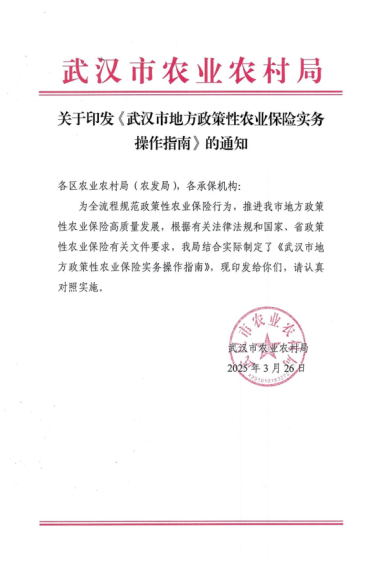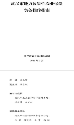 由武漢市農(nóng)業(yè)農(nóng)村局組織編制、湖北中信會計師事務(wù)所協(xié)助編制完成的《武漢市地方政策性農(nóng)業(yè)保險實務(wù)操作指南》(以下簡稱《操作指南》)正式印發(fā)。該《操作指南》不僅系武漢市政策性農(nóng)業(yè)保險實務(wù)首本操作指南,在全國也屬首創(chuàng),對我市貫徹落實國家及省市關(guān)于加快農(nóng)業(yè)保險高質(zhì)量發(fā)展及支持農(nóng)業(yè)農(nóng)村發(fā)展相關(guān)文件要求,提高金融支持農(nóng)業(yè)農(nóng)村發(fā)展能力,提升地方政策性農(nóng)業(yè)保險保障水平,預(yù)防和控制政策性農(nóng)業(yè)保險項目面臨的各類風(fēng)險,完善和規(guī)范政策性農(nóng)業(yè)保險服務(wù)工作具有重要意義并將發(fā)揮重大積極作用。