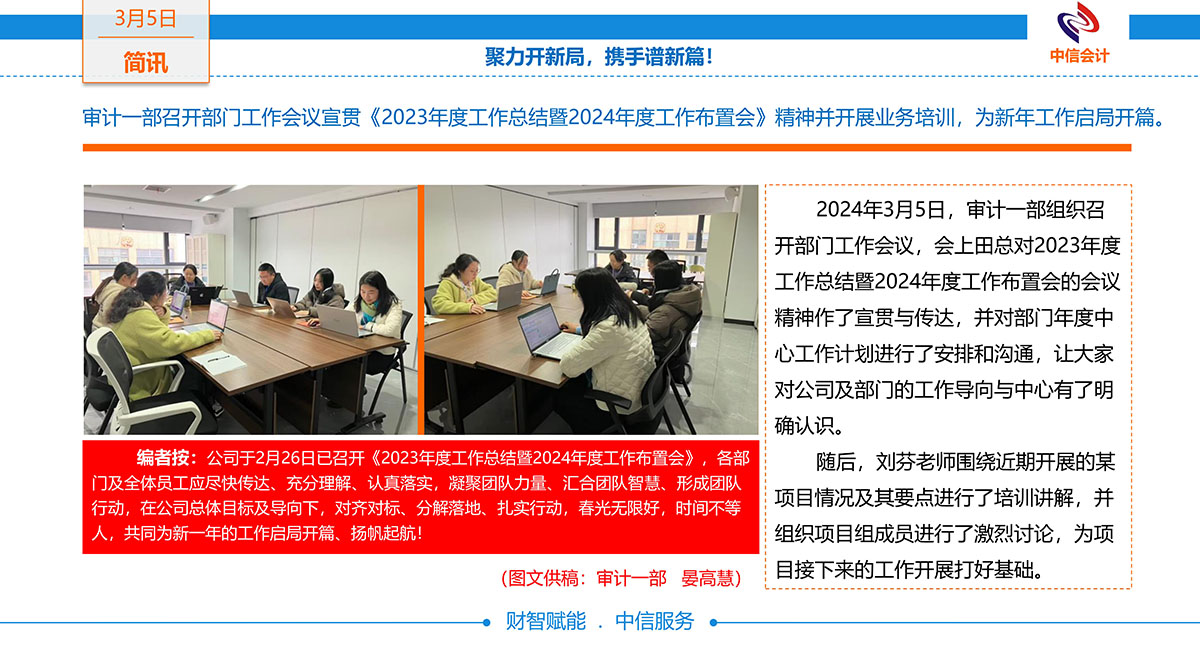 審計(jì)一部召開部門工作會(huì)議宣貫《2023年度工作總結(jié)暨2024年度工作布置會(huì)》精神并開展業(yè)務(wù)培訓(xùn),為新年工作啟局開篇